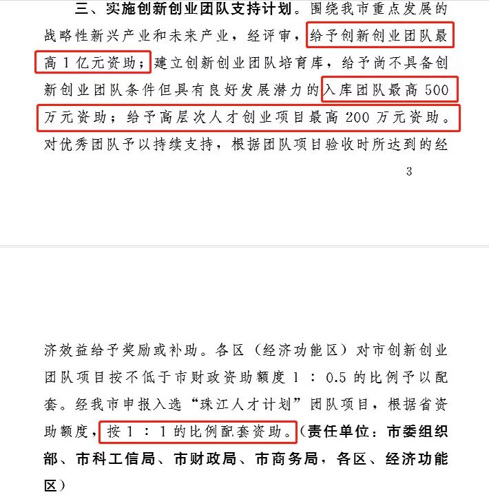 三、实施创新创业团队支持计划。围绕我市重点发展的战略性新兴产业和未来产业,经评审,给予创新创业团队最高1亿元资助;建立创新创业团队培育库,给予尚不具备创新创业团队条件但具有良好发展潜力的入库团队最高500万元资助; 给予高层次人才创业项目最高200万元资助。对优秀团队予以持续支持,根据团队项目验收时所达到的经济效益给予奖励或补助。各区(经济功能区) 对市创新创业团队项目按不低于市财政资助额度l:0.5的比例予以配套。经我市申报入选“珠江人才计划”团队项目,根据省资助额度,按1:1的比例配套资助。(责任单位:市委组织部、市科工信局、市财政局、市商务局,各区、经济功能区)