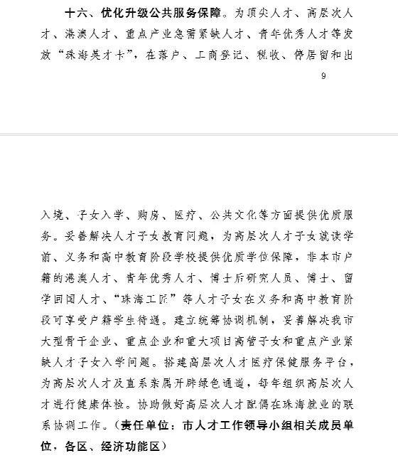 十六、优化升级公共服务保障。为顶尖人才、高层次人才、港澳人才、重点产业急需紧缺人才、青年优秀人才等发放“珠海英才卡”,在落户、工商登记、税收、停居留和出入境、子女入学、购房、医疗、公共文化等方面提供优质服务。妥善解决人才子女教育问题,为高层次人才子女就读学前、义务和高中教育阶段学校提供优质学位保障,非本市户籍的港澳人才、青年优秀人才、博士后研究人员、博士、留学回国人才、“珠海工匠”等人才子女在义务和高中教育阶段可享受户籍学生待遇。建立统筹协调机制,妥善解决我市大型骨干企业、重点企业和重大项目高管子女和重点产业紧缺人才子女入学问题。搭建高层次人才医疗保健服务平台,为高层次人才及直系亲属开辟绿色通道,每年组织高层次人才进行健康体检。协助做好高层次人才配偶在珠海就业的联系协调工作。(责任单位: 市人才工作领导小组相关成员单位,各区、经济功能区)