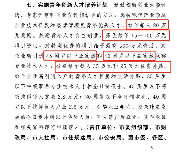 七、实施青年创新人才培养计划。通过创新创业大赛评选、专家评审和企业自评相结合的方式,选拔现代产业领域企业技术研发和经营管理类青年优秀人才,给予每人20万元奖励。鼓励青年人才自主创业择优给予15-100万元项目资助,对特别优秀的项目给予最高500万元资助。对企业新引进45周岁以下正高级和40周岁以下副高级职称专业技术人才,分别给予每人35万元和25万元住房补贴。给予企业新引进入户的青年人才租房和生活补贴,35周岁以下中级职称专业技术人才和全日制硕士、45周岁以下高级技师每人发放3.8万元;30周岁以下全日制本科、40周岁以下技师每人发放2.6万元。对毕业三年内、拟来珠海发展的全日制本科以上学历人员,可先落户后就业,凭毕业证和相关资料即可申请落户。(责任单位:市委组织部、市财政局、市人社局、市住规建局、市公安局、团市委、各区、经济功能区)