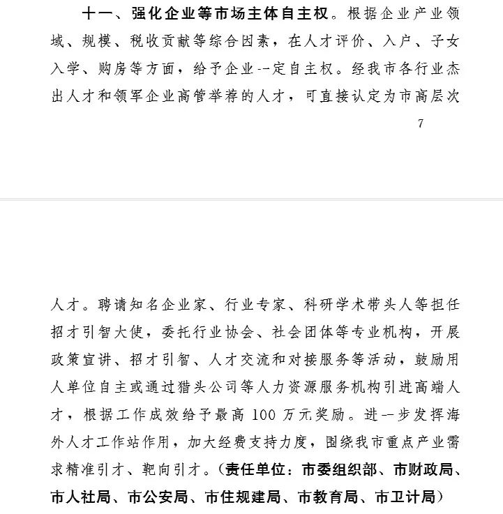 十一、强化企业等市场主体自主权。根据企业产业领域、规模、税收贡献等综合因素,在人才评价、入户、子女入学、购房等方面,给予企业--定自主权。经我市各行业杰出人才和领军企业高管举荐的人才,可直接认定为市高层次人才。聘请知名企业家、行业专家、科研学术带头人等担任招才引智大使,委托行业协会、社会团体等专业机构,开展政策宣讲、招才引智、人才交流和对接服务等活动,鼓励用人单位自主或通过猎头公司等人力资源服务机构引进高端人才,根据工作成效给予最高100万元奖励。进--步发挥海外人才工作站作用,加大经费支持力度,围绕我市重点产业需求精准引才、靶向引才。(责任单位:市委组织部、市财政局、市人社局、市公安局、市住规建局、市教育局、市卫计局)