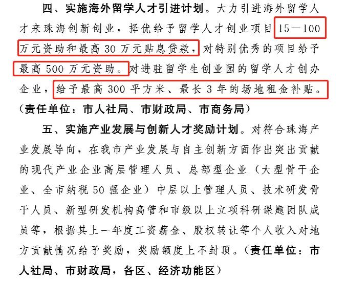 四、实施海外留学人才引进计划。大力引进海外留学人才来珠海创新创业,择优给予留学人才创业项目15-100万元资助和最高30万元贴息贷款,对特别优秀的项目给予最高500万元资助。对进驻留学生创业园的留学人才创办企业,给予最高300平方米、最长3年的场地租金补贴。(责任单位:市人社局、市财政局、市商务局)