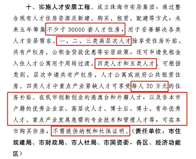 十、实施人才安居工程。成立珠海市安居集团,通过整合现有人才住房资源及新建、购买、租赁、配建等方式,未来五年筹集不少于30000套人才住房,用于妥善解决各类人才安居需求。一、二、三类高层次人才除享受住房补贴、共有产权房、公积金贷款优惠等安居政策,还可申请免租金入住人才公寓用于周转过渡。四类人才和五类人才,可根据类别、层次申请共有产权房、人才公寓或政府公共租赁住房。四类人才中重点产业紧缺人才可享受每人20万元的住房补贴。在我市创新创业的港澳台和外籍人才,以及非本市户籍的优秀企业家、高层次人才、博士后、博士、青年优秀人才、重点产业发展急需的专业技术和管理人才等,可在本市购买住房,不需提供纳税和社保证明。(责任单位:市住规建局、市财政局、市人社局、市国资委,各区、经济功能区)