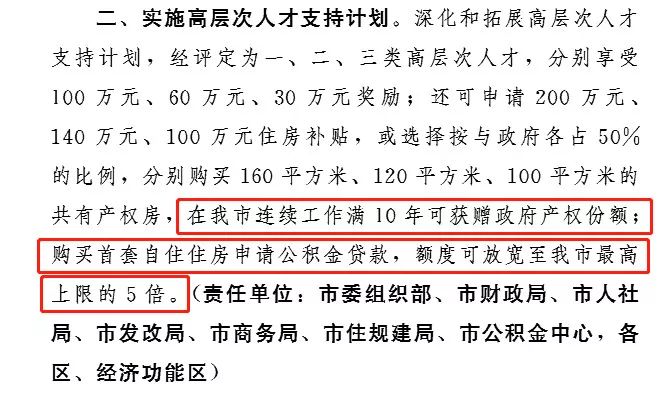 二、实施高层次人才支持计划。深化和拓展高层次人才支持计划,经评定为一、二、三类高层次人才,分别享受100万元、60万元、30万元奖励;还可申请200万元、140万元、100万元住房补贴,或选择按与政府各占50%的比例,分别购买160平方米、120平方米、100平方米的共有产权房,在我市连续工作满10年可获赠政府产权份额;购买首套自住住房申请公积金贷款,额度可放宽至我市最高上限的5倍。(责任单位:市委组织部、市财政局、市人社局、市发改局、市商务局、市住规建局、市公积金中心,各区、经济功能区)