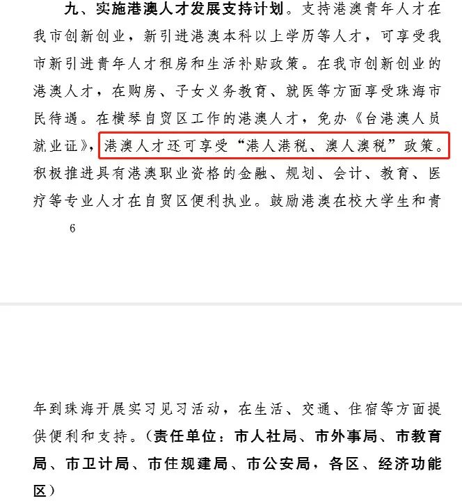 九、实施港澳人才发展支持计划。支持港澳青年人才在我市创新创业,新引进港澳本科以上学历等人才,可享受我市新引进青年人才租房和生活补贴政策。在我市创新创业的港澳人才,在购房、子女义务教育、就医等方面享受珠海市民待遇。在横琴自贸区工作的港澳人才,免办《台港澳人员就业证》,港澳人才还可享受“港人港税、澳人澳税”政策。积极推进具有港澳职业资格的金融、规划、会计、教育、医疗等专业人才在自贸区便利执业。鼓励港澳在校大学生和青年到珠海开展实习见习活动,在生活、交通、住宿等方面提供便利和支持。(责任单位:市人社局、市外事局、市教育局、市卫计局、市住规建局、市公安局、各区、经济功能区)