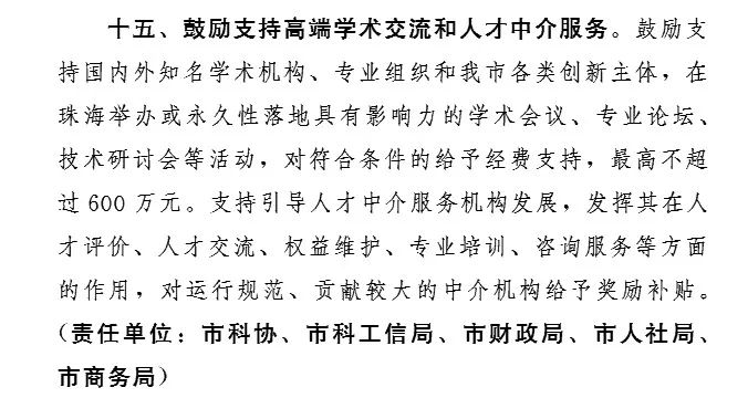十五、鼓励支持高端学术交流和人才中介服务。鼓励支持国内外知名学术机构、专业组织和我市各类创新主体,在珠海举办或永久性落地具有影响力的学术会议、专业论坛、技术研讨会等活动,对符合条件的给予经费支持,最高不超过600 万元。支持引导人才中介服务机构发展,发挥其在人才评价、人才交流、权益维护、专业培训、咨询服务等方面的作用,对运行规范、贡献较大的中介机构给予奖励补贴。(责任单位: 市科协、市科工信局、市财政局、市人社局、市商务局)