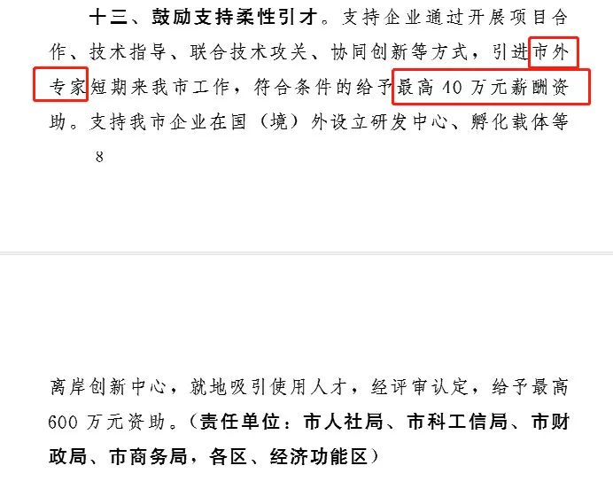 十三、鼓励支持柔性引才。支持企业通过开展项目合作、技术指导、联合技术攻关、协同创新等方式,引进市外专家短期来我市工作,符合条件的给予最高40万元薪酬资助。支持我市企业在国(境) 外设立研发中心、孵化载体等离岸创新中心,就地吸引使用人才,经评审认定,给予最高600万元资助。(责任单位:市人社局、市科工信局、市财政局、市商务局,各区、经济功能区)