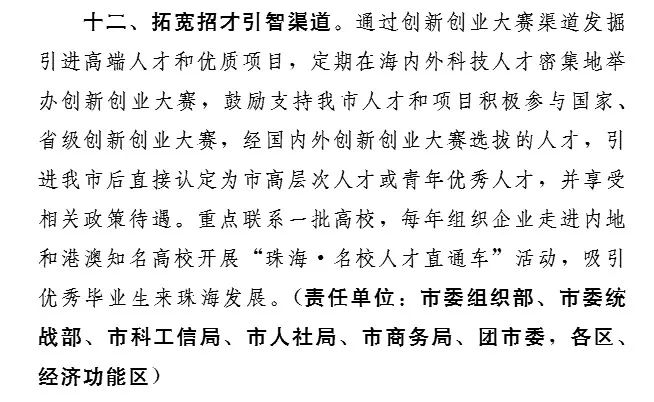 十二、拓宽招才引智渠道。通过创新创业大赛渠道发掘引进高端人才和优质项目,定期在海内外科技人才密集地举办创新创业大赛,鼓励支持我市人才和项目积极参与国家、省级创新创业大赛,经国内外创新创业大赛选拔的人才,引进我市后直接认定为市高层次人才或青年优秀人才,并享受相关政策待遇。重点联系一批高校,每年组织企业走进内地和港澳知名高校开展“珠海。名校人才直通车”活动,吸引优秀毕业生来珠海发展。(责任单位:市委组织部、市委统战部、市科工信局、市人社局、市商务局、团市委,各区、经济功能区)