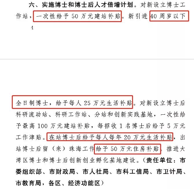 六、实施博士和博士后人才倍增计划。对新设立博士工作站,一次性给予50万元建站补贴。新引进40周岁以下全日制博士,给予每人25万元生活补贴。对新设立博士后科研流动站、科研工作站、分站和创新实践基地,一次性给予最高100万元建站补贴,每招收1名博士后给予5万元工作津贴。在站博士后给予每人每年20万元生活补贴,出站博士后留(来)珠海工作给予50万元住房补贴。推进大湾区博士和博士后创新创业孵化基地建设。(责任单位:市委组织部、市财政局、市人社局、市科工信局、市卫计局、市教育局、各区、经济功能区)