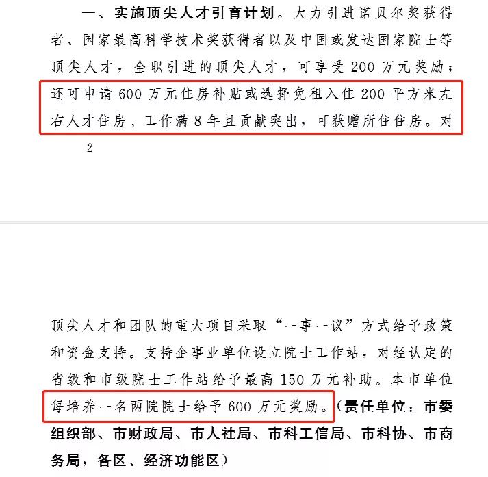 一、实施顶尖人才引育计划。大力引进诺贝尔奖获得者、国家最高科学技术奖获得者以及中国或发达国家院士等顶尖人才,全职引进的顶尖人才,可享受200万元奖励;还可申请600万元住房补贴或选择免租入住200平方米左右人才住房,工作满8年且贡献突出,可获赠所住住房。对顶尖人才和团队的重大项目采取“一事一议”方式给予政策和资金支持。支持企事业单位设立院士工作站,对经认定的省级和市级院士工作站给予最高150万元补助。本市单位每培养一名两院院士给予600万元奖励。(责任单位:市委组织部、市财政局、市人社局、市科工信局、市科协、市商务局,各区、经济功能区)