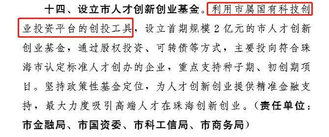 十四、设立市人才创新创业基金。利用市属国有科技创业投资平台的创投工具,设立首期规模2亿元的市人才创新创业基金,通过股权投资、可转债等方式,主要投向符合珠海市认定标准人才创办的企业,重点支持种子期、初创期项目。坚持政策性基金定位,为人才创新创业提供精准金融支持,最大力度吸引高端人才在珠海创新创业。(责任单位:市金融局、市国资委、市科工信局、市商务局)
