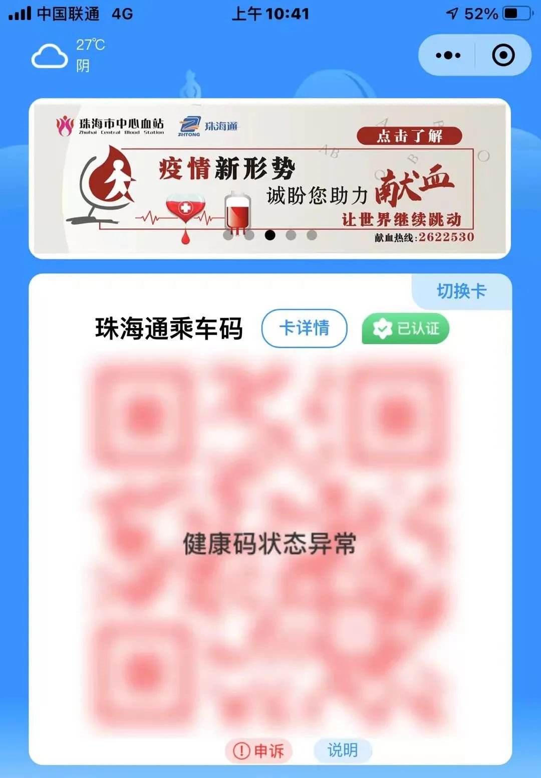 如珠海通乘车码为红码(马赛克码),则表示健康码状态异常。