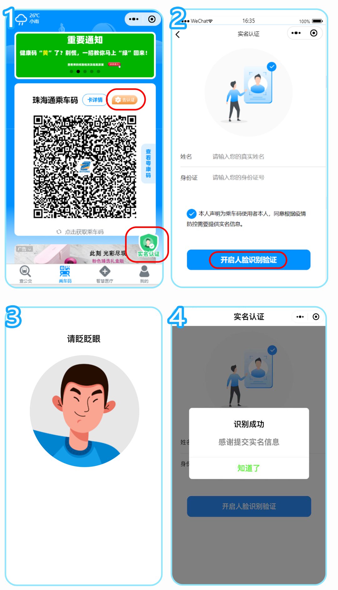 可以点击首页“实名认证”图标,根据操作指引认证通过后,系统自动更新珠海通乘车码颜色。