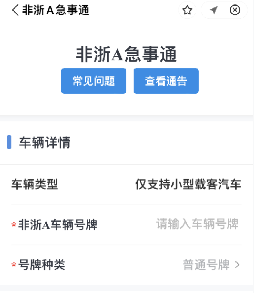 2.然后会进入到申请页面,如实填写车牌信息、计划通行时间等内容。点击“常见问题”可查看各位车主普遍遇到的问题、点击“查看通告”可查看官方政策原文