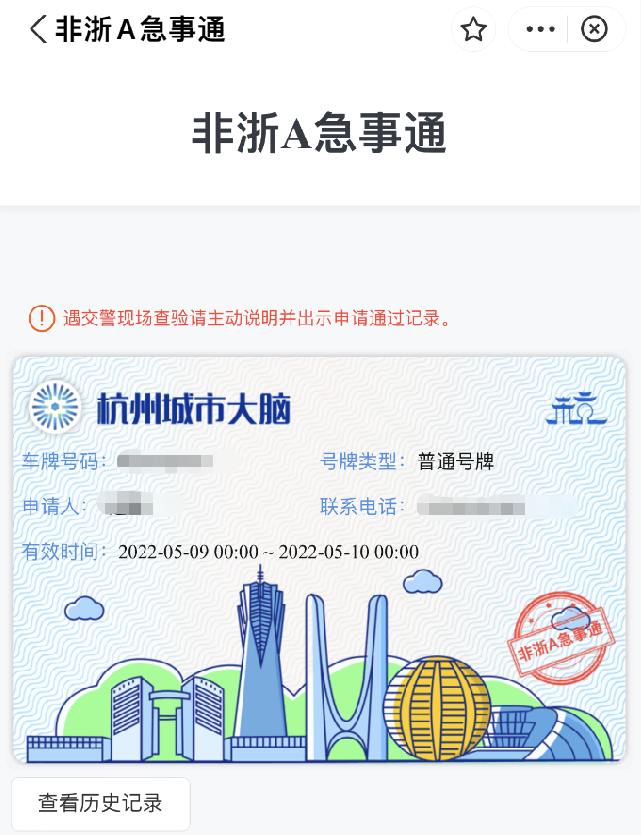 4.当出现如下页面的时候,即为申请成功!请记得截图保存,如果遇到交警现场要求查验的话,可出示截图给交警查验(提前截图保存,避免手忙脚乱的一时间找不到打开记录就很耽误时间呢)