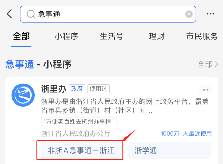 1.打开支付宝APP,在上方搜索栏内搜索"急事通",然后点击如下图红框圈中的"非浙A急事通-浙江"