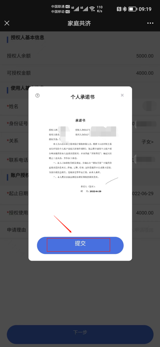 签字完成后,系统自动生成个人承诺书,请仔细阅读个人承诺书,确认没有问题后点击”提交”完成家庭成员添加。