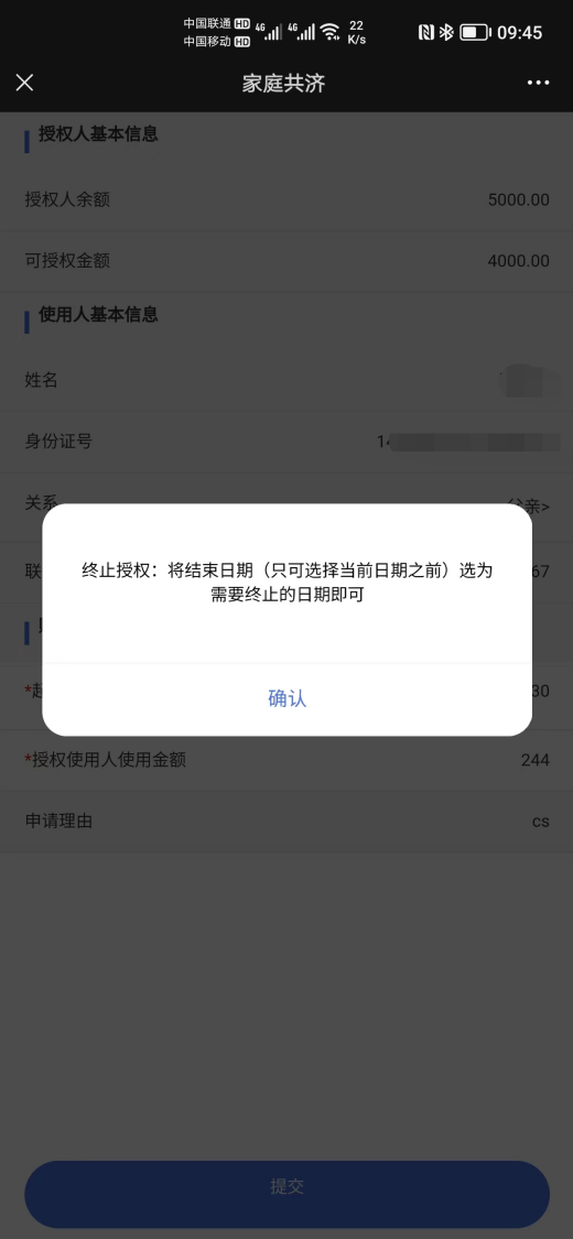 终止授权:将结束日期 (只可选择当前日期之后,结束日期之前) 选为需要终止的日期即可,点击提交后生效。
