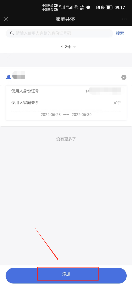 进入家庭共济页面,点击”添加”按钮,新增共济账户。