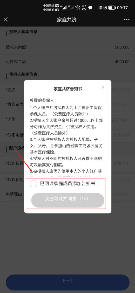 请仔细阅读《家庭共济告知书》的详细内容,然后勾选”已阅读家庭成员添加告知书”,并点击”我已阅读并同意”,进入下一步。