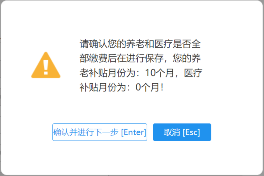 第八步:点击“下一步”后,会提示确认医疗及养老补贴月份,确认无误后点击“确认并进行下一步”进行上传附件信息,若点击“取消按钮”则取消此次申报。