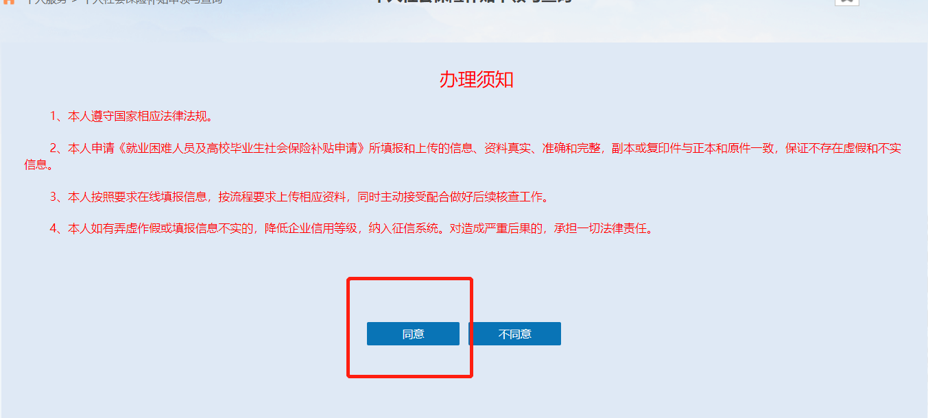 第五步:阅读“办理须知”后,点击“同意”按钮进行申报。