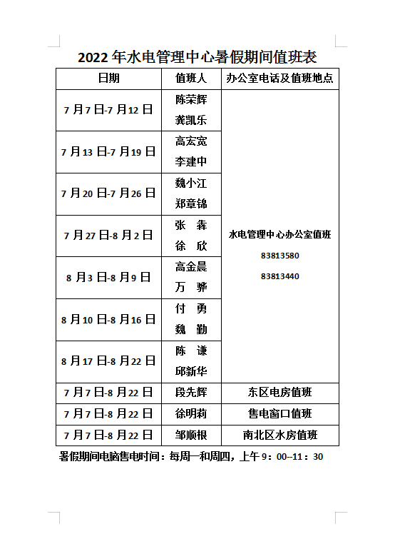2022年水电管理中心暑期值班安排表如下:
