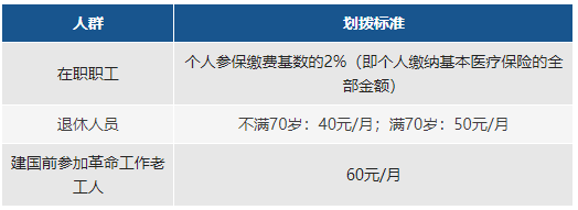 职工基本医疗保险个人账户根据不同人群,分为不同的划拨标准,如下表所示: