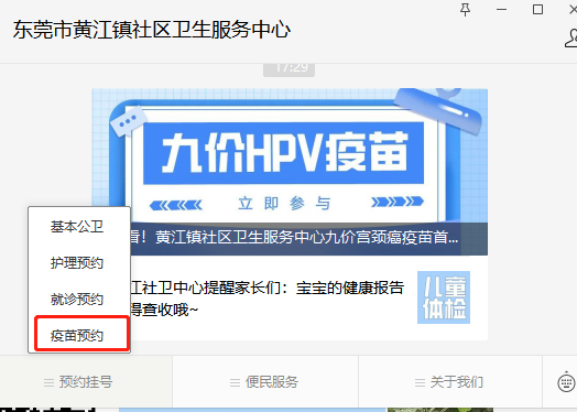 1.关注【东莞市黄江镇社区卫生服务中心】公众号