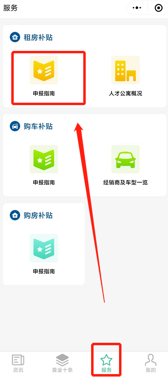 2、点击“服务”栏目,找到“租房补贴”,点击“申报指南”;
