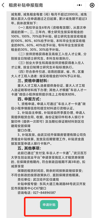 3、仔细阅读武汉经开区人才公寓租房补贴申报指南,然后点击“申请补贴”;