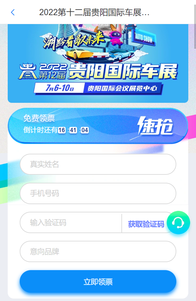 2.小程序报名界面填写:姓名、手机号码、意向品牌,获取验证码,然后点击“立即领票”