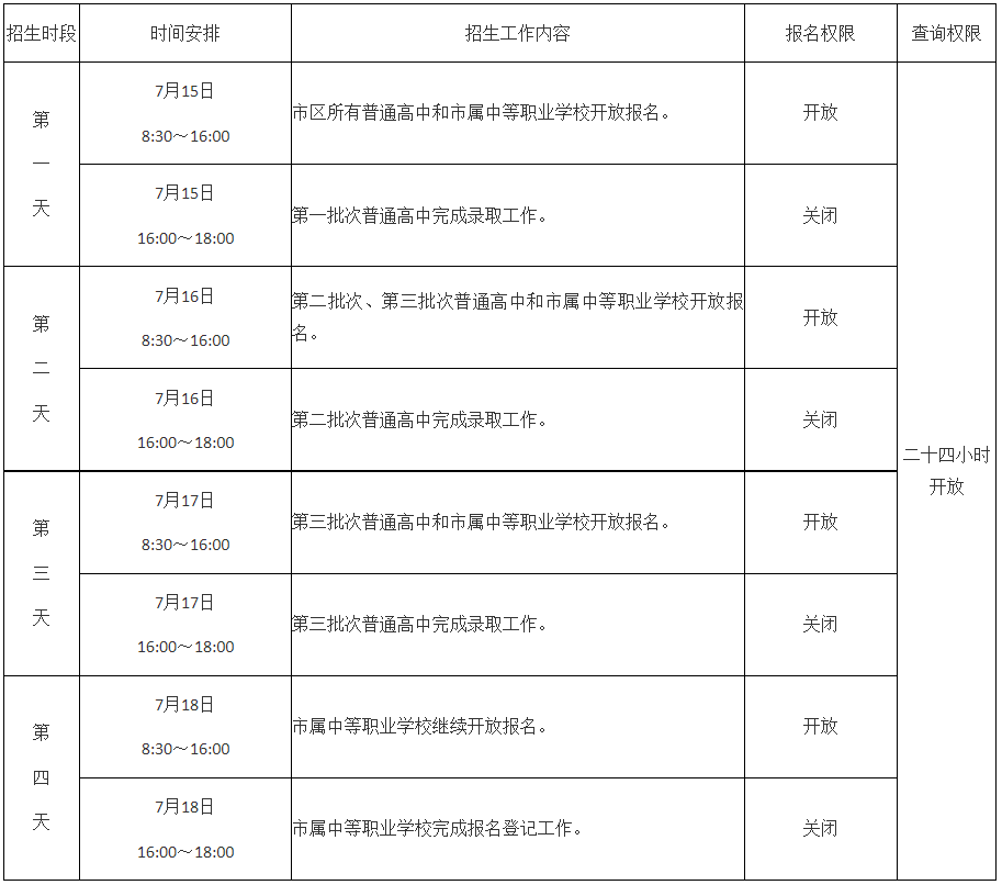市区高中阶段学校统一招生工作在7月15日至18日进行,其中普通高中招生在7月15日至17日三天时间内进行,在录取时间内各校的指令性(含定向生和非定向生)和指导性招生计划同时完成。中等职业学校招生工作与普通高中招生工作同步开始,7月18日完成网上报名登记工作。
