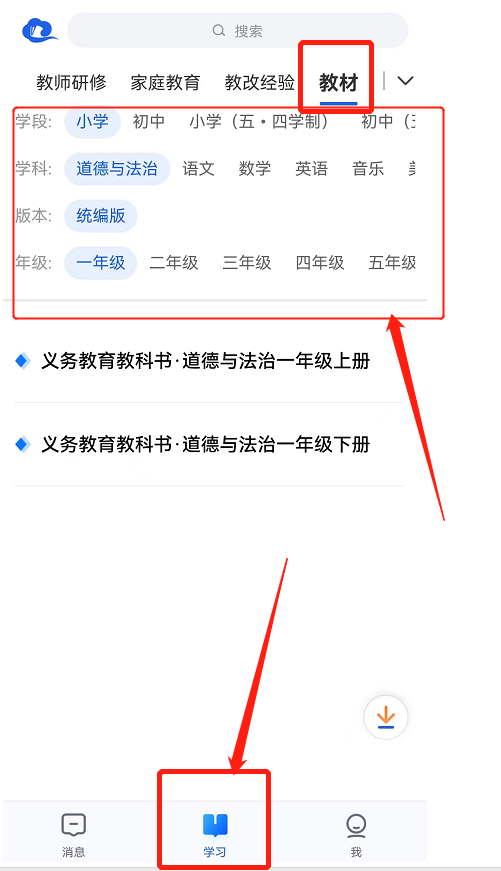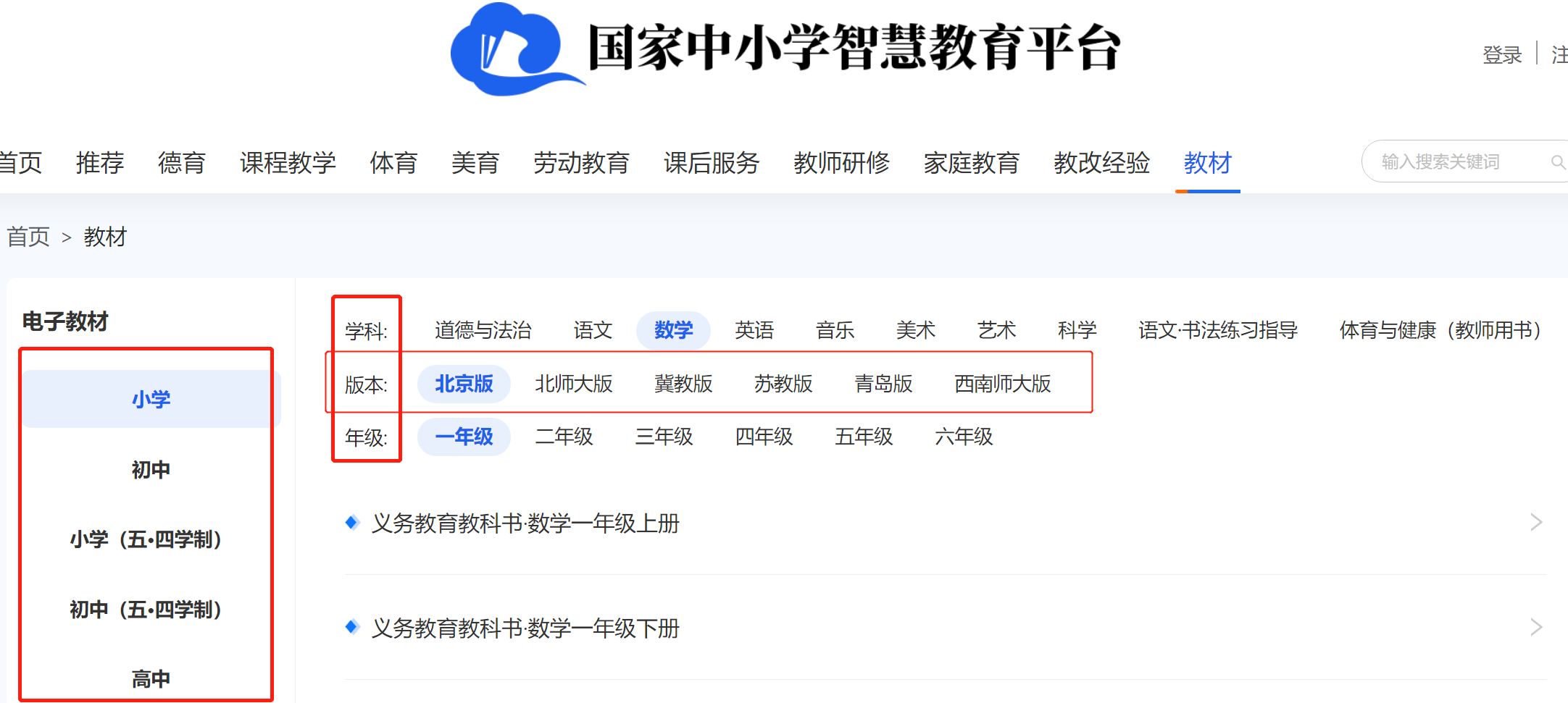 进入官网后,上方选择点击“教材”,然后可选择不同年级、学科、版本。
