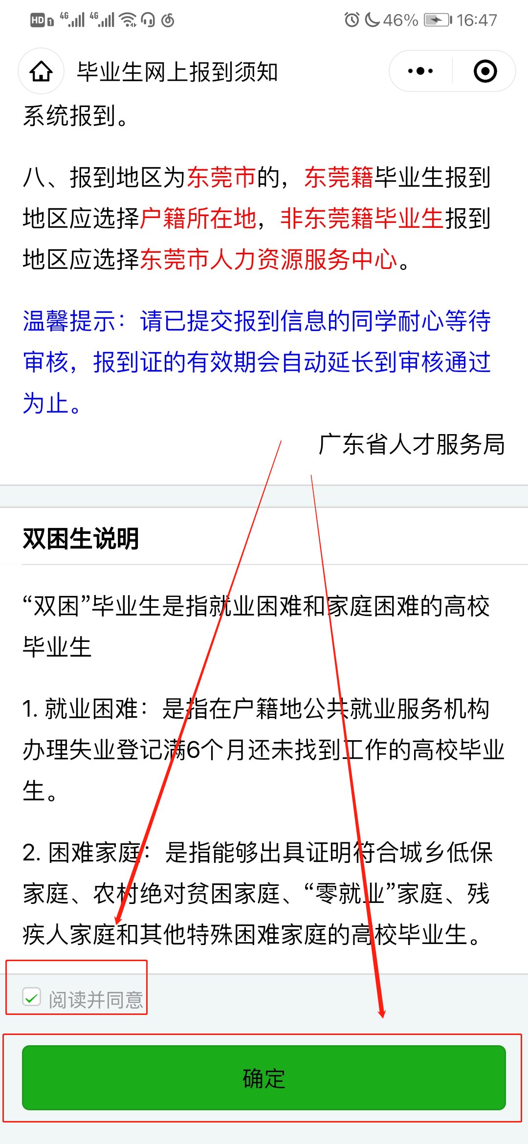 4.阅读毕业生网上报到须知后,勾选同意,并点击“确定”;