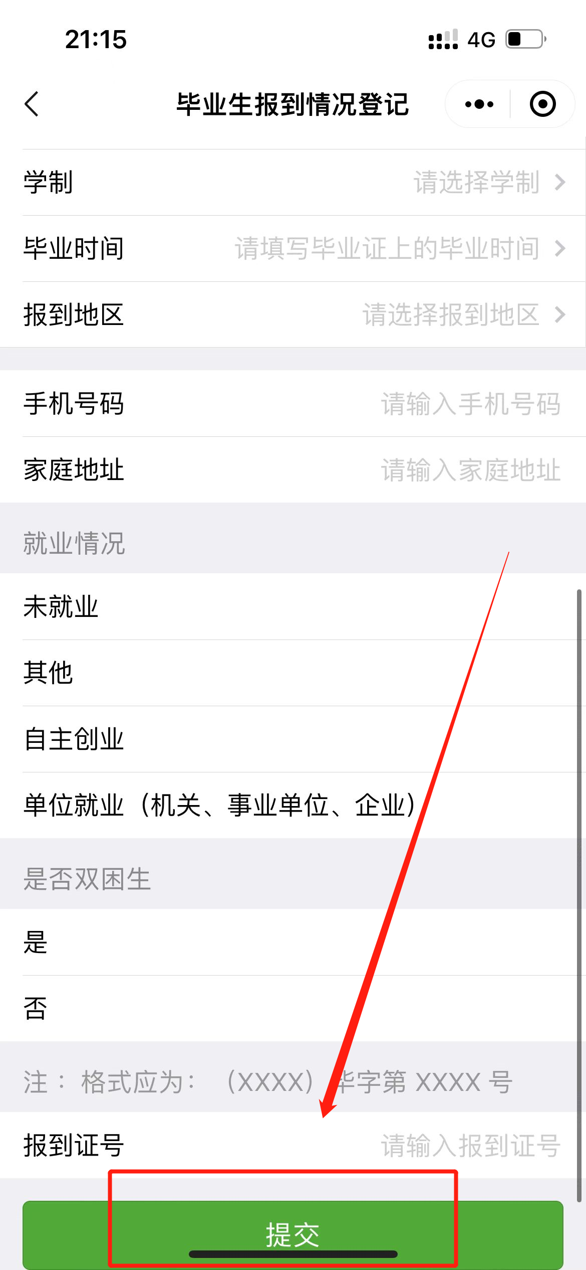 5.在个人情况登记界面中按照个人情况如实填写个人报到信息后,点击页面最下方的“提交”即可。