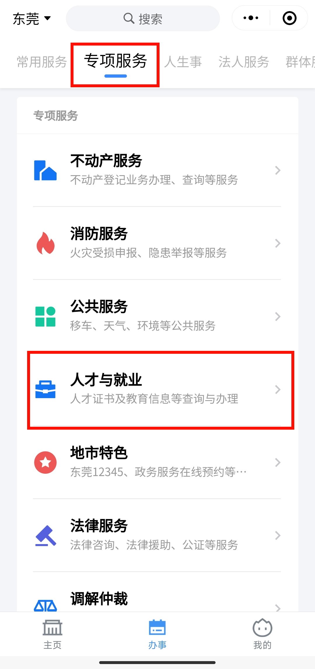 2.进入小程序后,在小程序主页中点击“办事”,点击专项服务中的“人才与就业”;