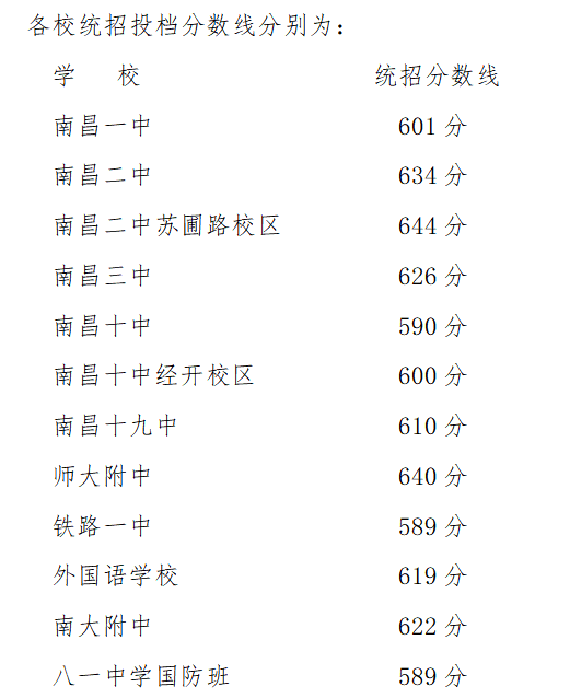 ➤南昌市2022年第一批次省级重点高中投档分数线划定: