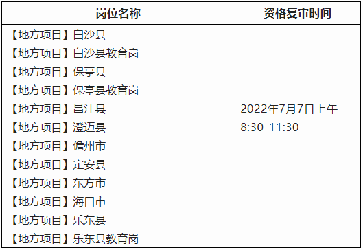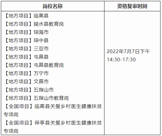 海南省根据附件1的全国项目通过笔试合格分数线的报考人员,按照笔试成绩排名,将按照笔试成绩由高到低依次选岗,【全国项目】海南省选岗时间及资格复审安排如下: