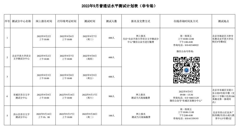2022年9月北京普通话水平测试考试时间安排表(非专场)