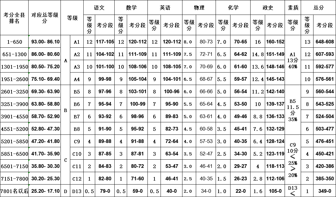 ➤2022年南昌县中招改革等级制各科(含总分)等级/等级分/考分段情况一览表:
