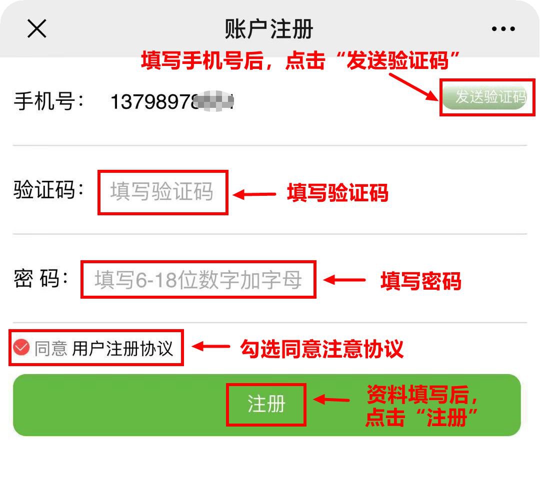 2.账户注册:输入“手机号”→点击“发送验证码”→填写验证码→设置密码→勾选“同意用户注册协议”→点击“注册”。