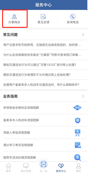 第二步:点击首页下方“服务中心”栏目中的“办事网点”,选中“驾驶人体检”,