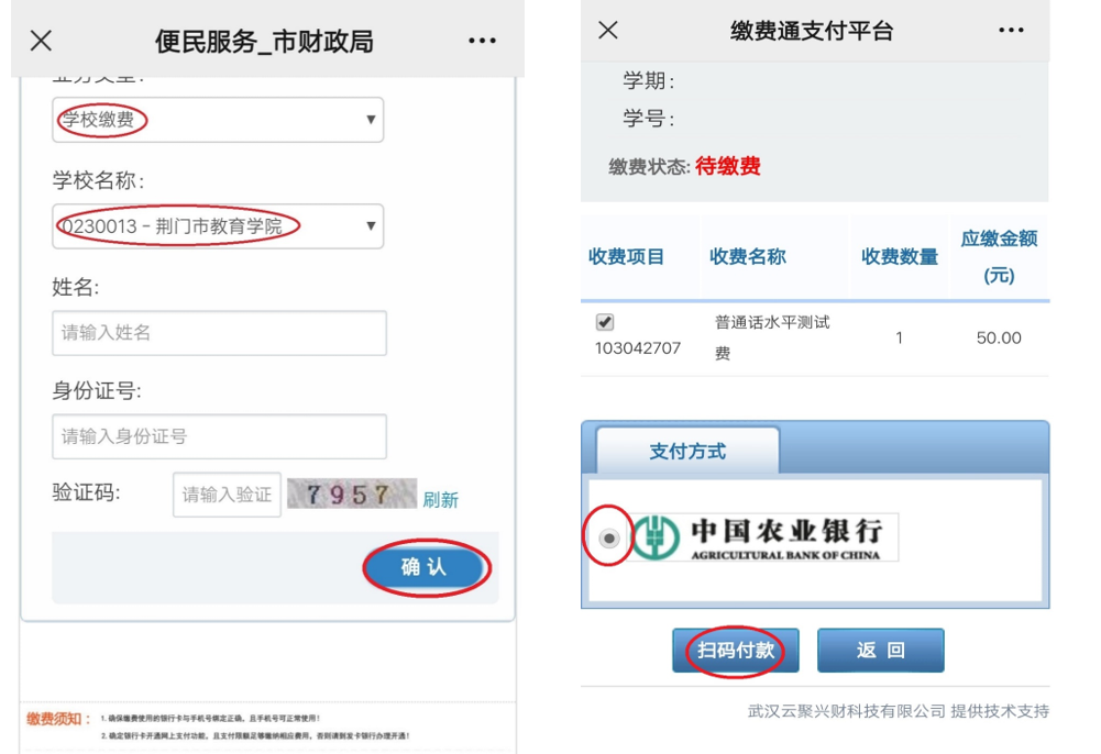 2.选择业务类型为“学校缴费”、学校名称为“荆门市教育学院”,再输入待缴费的学生姓名、身份证号及验证码点击“确认”按钮,进入缴费信息显示页面,请仔细核对显示的待缴费信息是否正确,如有疑问请与测试站工作人员联系,核对无误后,选择“中国农业银行”“扫码付款”。