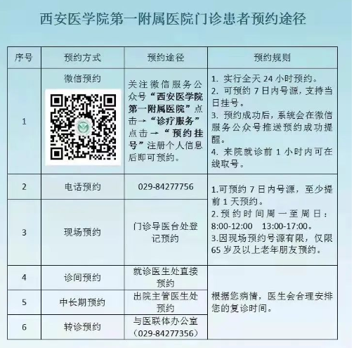 一、急诊、发热门诊、核酸采样处24小时开诊,普通门诊实行“实名制分时段非急诊全预约就诊模式”,患者朋友可通过西安医学院第一附属医院微信服务公众号进行预约挂号就诊,请您提前实名制预约挂号、有计划就医,按照预约时间段提前60分钟来院。为减少医院人员聚集,门诊就诊实行非必要不陪同,门诊将全程为您服务(咨询电话:029-84277756,上班时间:8:00-12:00 13:00-17:00)。