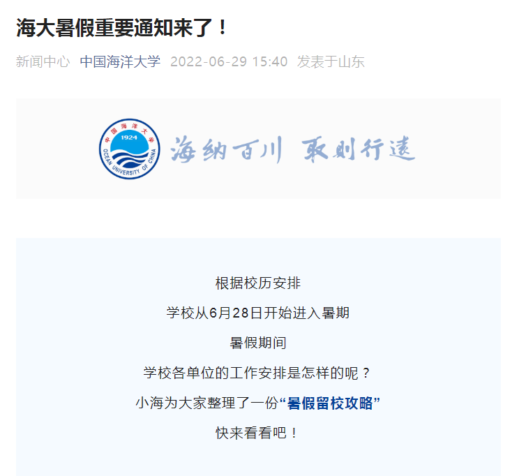 2022年6月28日开始放假,8月14日(星期日)在校生注册报到、教职员工上班。