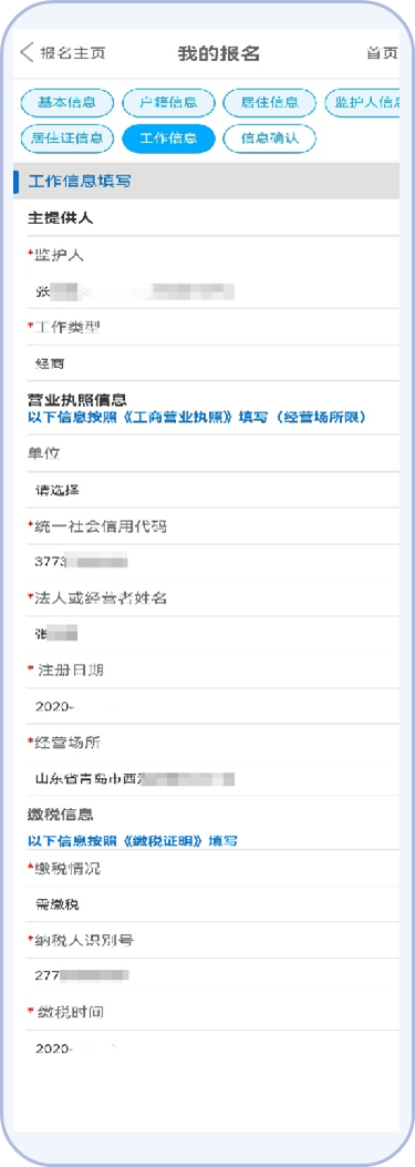 (1)工作信息分为经商和务工,选择最符合入学条件的进行信息登记。