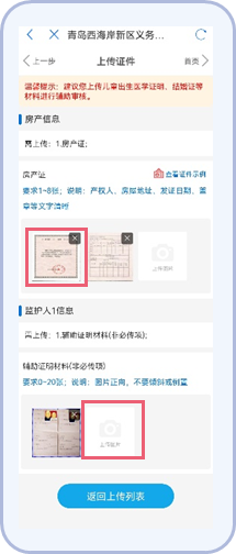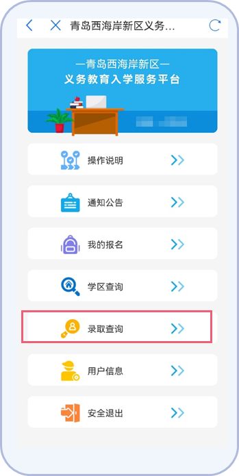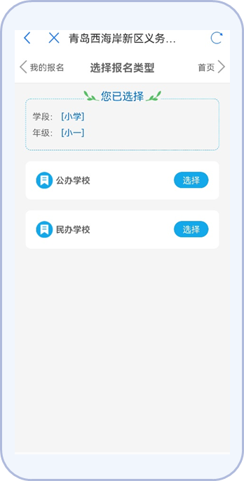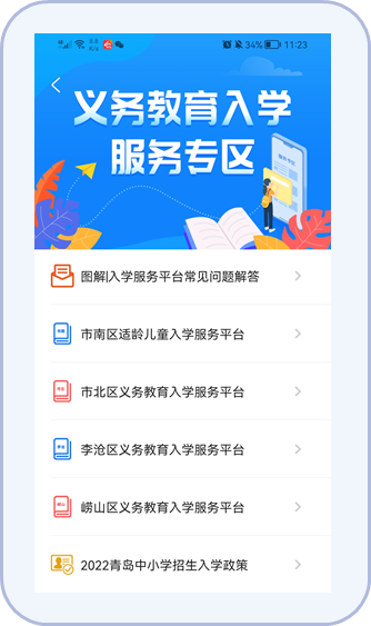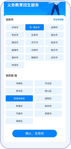 1.“爱山东青e办”APP:首页进入“义务教育”入学专区,找到“西海岸新区义务教育入学服务平台”点击进入。