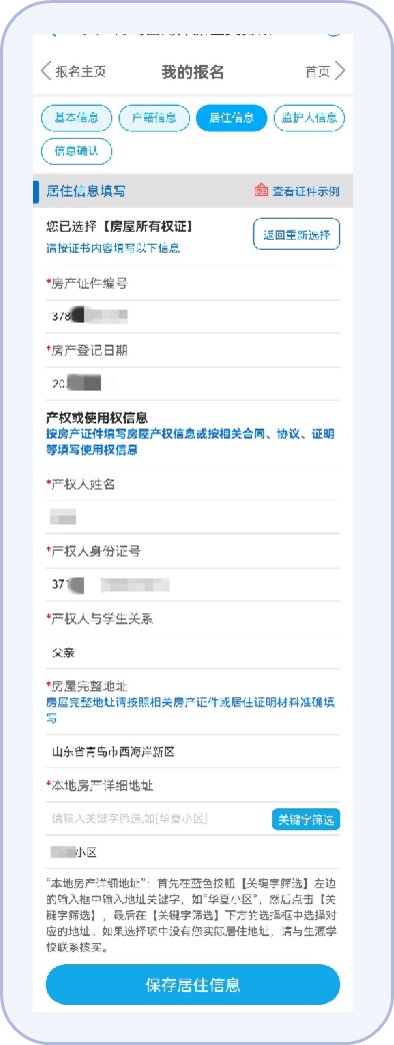 9.按照平台提示填写监护人房产或其他居住信息。