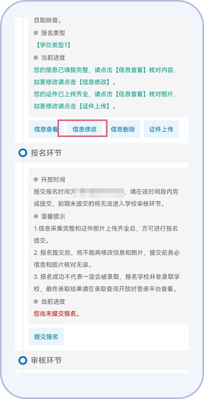 17.在信息采集开放期间,报名提交之前,您可以对信息和图片进行修改,不限修改次数。在学校审核期间,如果您的信息或图片不符合条件,学校对信息【驳回修改】的,也可以进行修改,并在修改完成后点击【提交修改】。