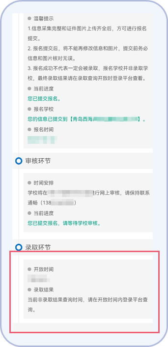 18.在录取查询开放时间内,点击【录取查询】,可查看学生录取结果及其他通知内容。